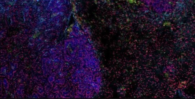 Các tế bào miễn dịch (màu xanh lục) tập trung ở rìa của khối u ung thư phổi. Ảnh: Viện Francis Crick