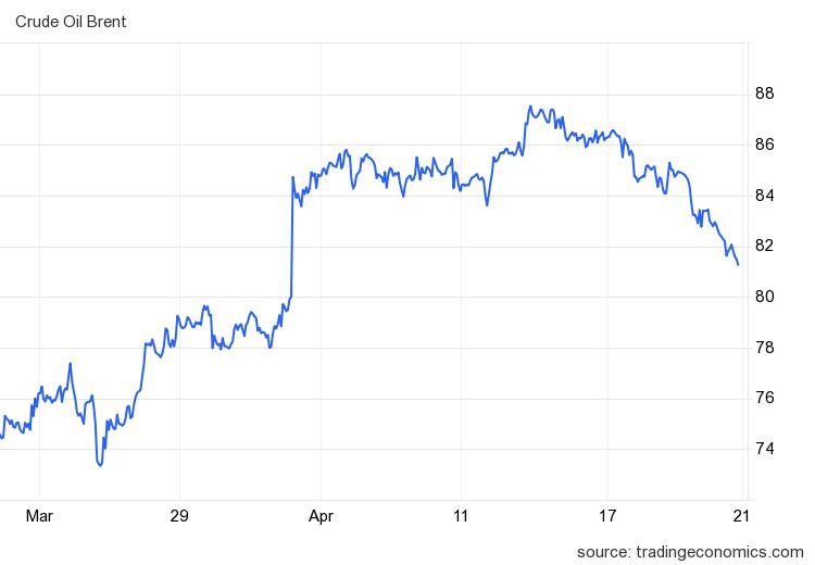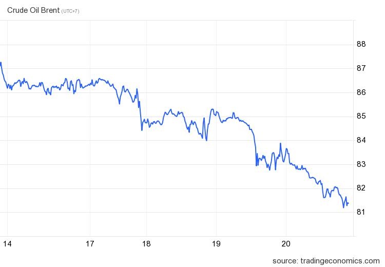 Theo Trading Economics, giá dầu Brent toàn cầu đã rơi xuống 81,3 USD/thùng, đánh dấu mức thấp nhất trong gần 3 tuần. Dầu WTI chuẩn Mỹ cũng sụt giá mạnh xuống 77,22 USD/thùng.