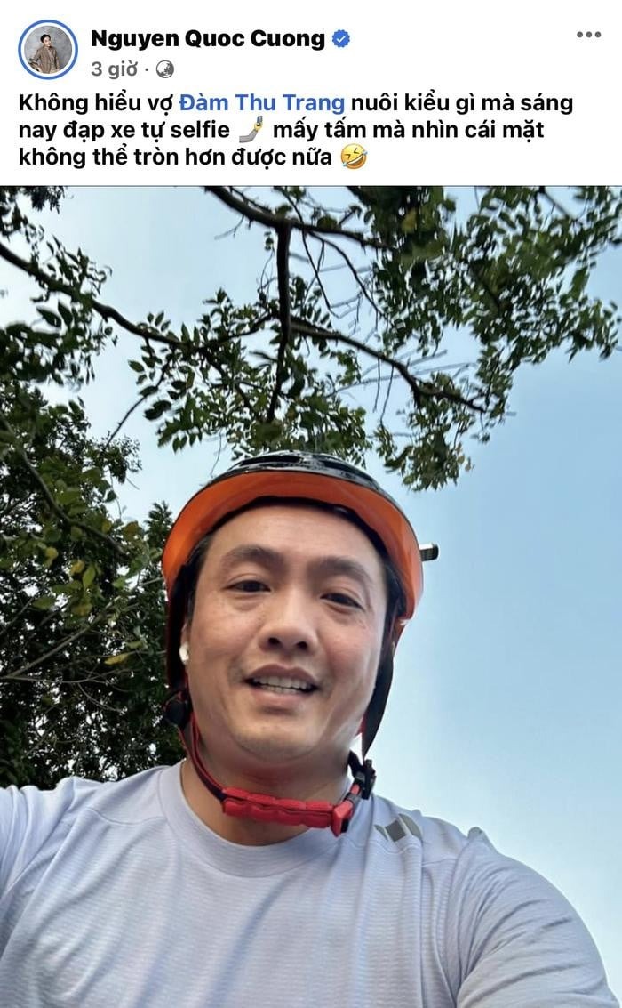 Mới đây, Cường Đô La đăng tải khoảnh khắc đạp xe nâng ca sức khỏe. Anh trách bà xã: “Không hiểu vợ Đàm Thu Trang nuôi kiểu gì mà sáng nay đạp xe tự selfie mấy tấm mà nhìn cái mặt không thể tròn hơn được nữa”.