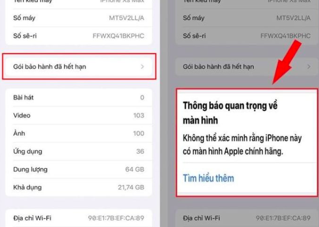Ở phía dưới, bạn sẽ thấy mục Gói bảo hành và hãy nhấp vào đó, nếu có xuất hiện "Thông báo quan trọng về màn hình" và có nội dung "Không thể xác minh rằng iPhone này có màn hình Apple chính hãng", thì khả năng cao là điện thoại của đã được thay màn hình rồi.