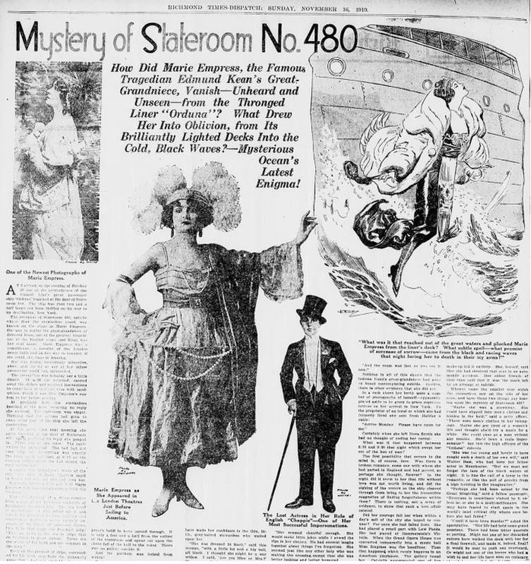 4. Marie Empress là một nữ diễn viên người Anh bị mất tích trên một tàu viễn dương vào năm 1919, ngay trước khi nó được chuẩn bị cập cảng ở New York. Cô được nhìn thấy lần cuối bởi một nữ tiếp viên đã mang cho cô một cốc nước và Marie Empress được cho là đã chết sau khi bị rơi xuống tàu.