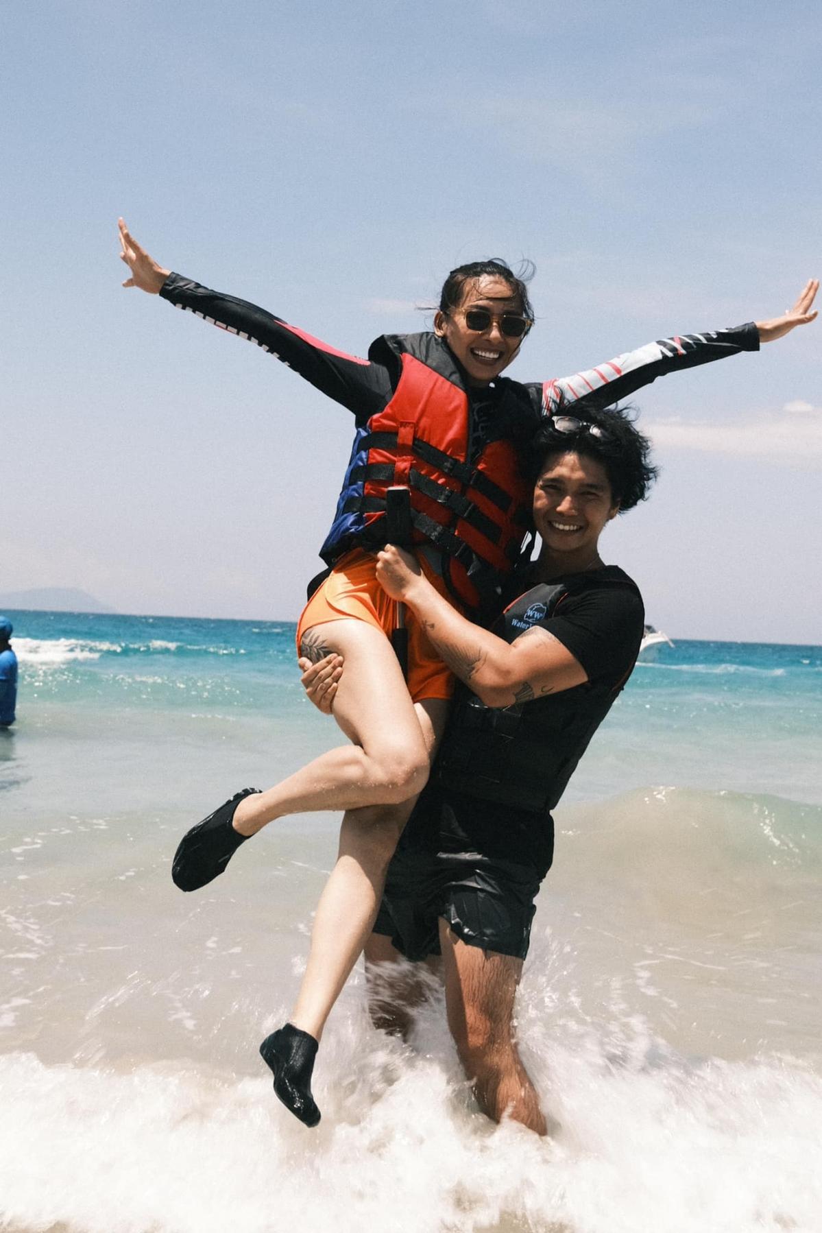 "Đả nữ" Ngô Thanh Vân hạnh phúc khi được chồng trẻ bế bổng trên biển. Trên bãi biển ở Nha Trang, cặp đôi và bạn bè đã có những khoảnh khắc vui chơi đầy thú vị.