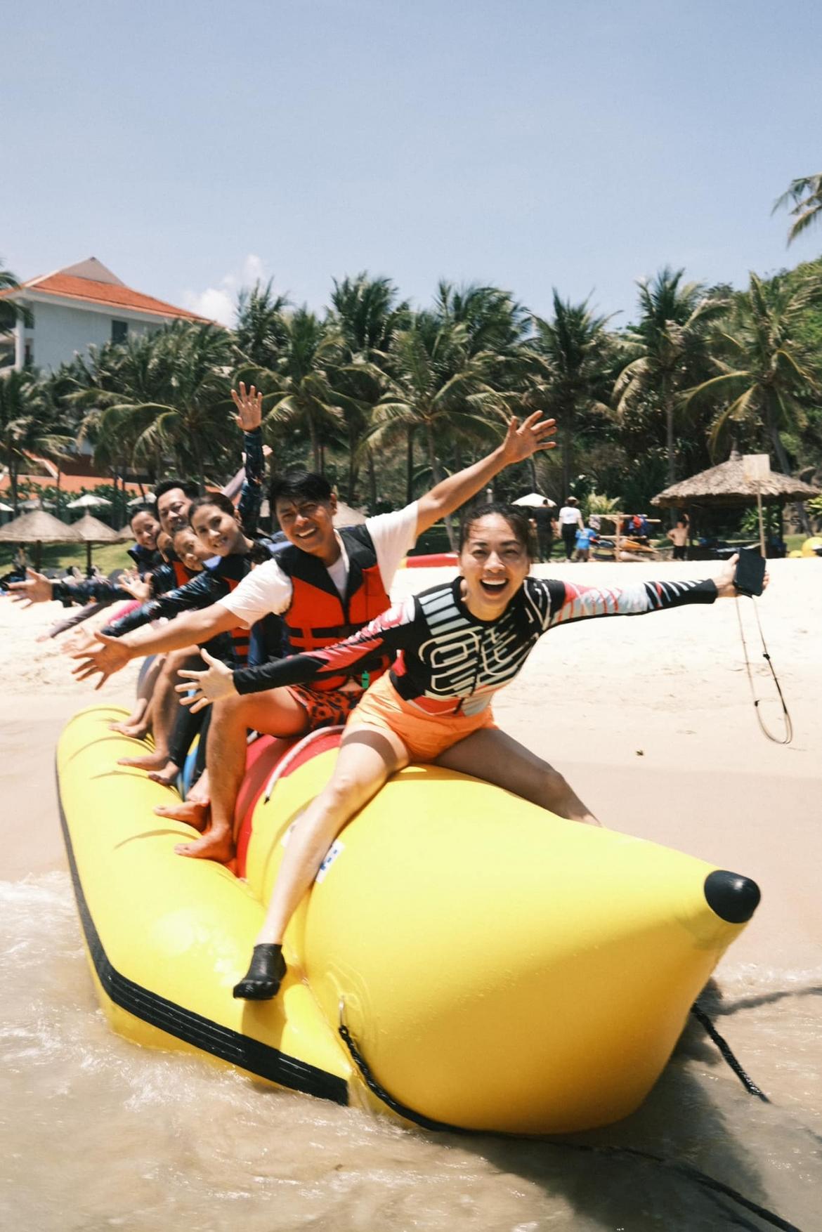 Cô cùng Huy Trần và bạn bè vui vẻ chơi các trò chơi mạo hiểm.