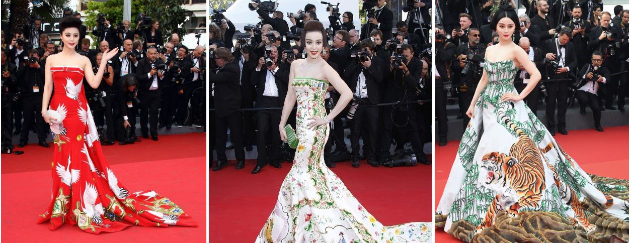 Trong 2 tuần tham dự Cannes, người đẹp sinh năm 1981 xuất hiện với diện mạo trau chuốt lộng lẫy và biến hóa. Truyền thông Trung Quốc thống kê nữ diễn viên diện tổng cộng 18 bộ trang phục tại LHP.