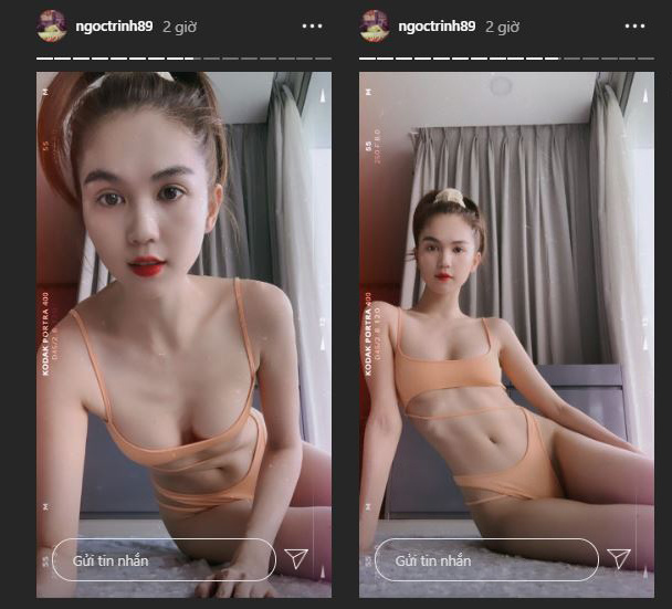Phớt lờ phát ngôn công kích của đàn em, mới đây, Ngọc Trinh khiến fan hâm mộ "mất máu" khi tung loạt ảnh và clip diện bikini màu cam đào ngọt ngào lên mạng xã hội. Thông qua clip và hình ảnh, người đẹp khoe trọn vóc dáng gợi cảm, vòng 3 căng tròn.