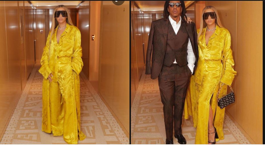 Tạm rời xa những bộ đồ lộng lẫy, lấp lánh trên sân khấu, Beyoncé nổi bật với set đồ tông vàng tại show thời trang. Cô sánh vai cùng Jay-Z. Trang phục của cặp sao nhìn sang trọng nhưng vẫn đầy sành điệu. Ảnh: beyonce.