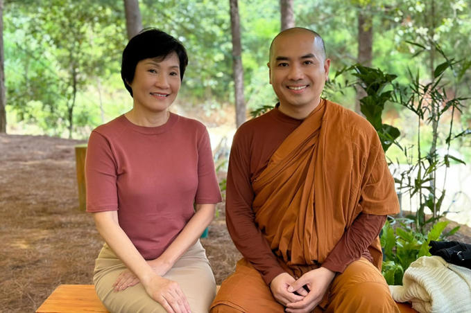 Hồng Đào bên sư thầy Minh Niệm hôm 12/7. Cả hai từng cộng tác trong chương trình âm nhạc chữa lành Chỉ tình thương ở lại đầu tháng 7 ở TP HCM. Nhiều đồng nghiệp, người quen như nghệ sĩ Hồng Vân, nhà thiết kế Minh Châu khen kiểu tóc ngắn khiến diễn viên trẻ hơn vài tuổi.