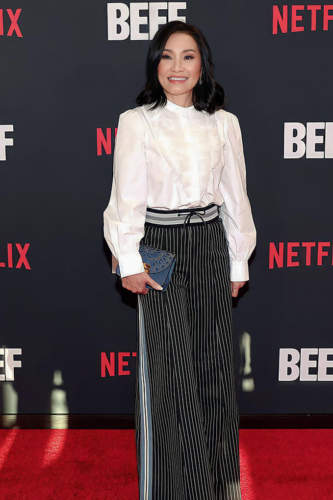 Hồng Đào diện phong cách đơn sắc khi dự buổi công chiếu "Beef" - series hài gây sốt toàn cầu hồi tháng 4 tại Mỹ. Trong phim, chị vào vai Hanh Trinh - mẹ của nữ chính Amy Lau (Ali Wong), một phụ nữ thành đạt nhưng chịu nhiều ẩn ức trong hôn nhân.