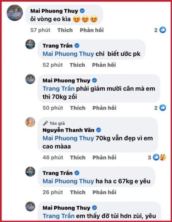 Vừa, Hoa hậu Mai Phương Thúy xuất hiện với vẻ ngoài kém thon gọn nên nhiều người đồn đại cô có bầu. Đến sáng 16/7, Mai Phương Thúy lại có động thái tiết lộ chuyện cân nặng hiện tại. Cụ thể, dưới phần bình luận bài viết của Vân Hugo, nàng hậu than thở: "Phải giảm 10 cân mà em thì 70kg rồi". Vân Hugo cũng gửi lời động viên: "70kg vẫn đẹp vì em cao mà". Mai Phương Thúy mới thở phào: "Em thấy đỡ tủi hơn rồi, yêu chị".