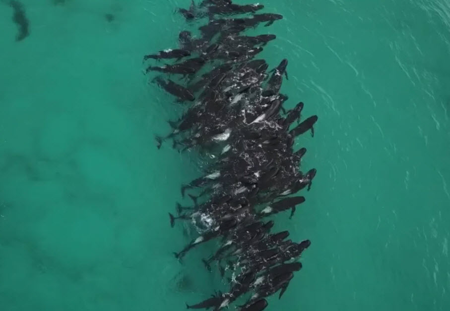 Video đăng tải trên mạng xã hội cho thấy hàng chục con cá voi mắc cạn còn sống. Một số nằm nghiêng, số khác nằm ngửa. Chúng vẫy đuôi ở vùng nước nông. Một video khác cho thấy những con cá voi rúc vào nhau.