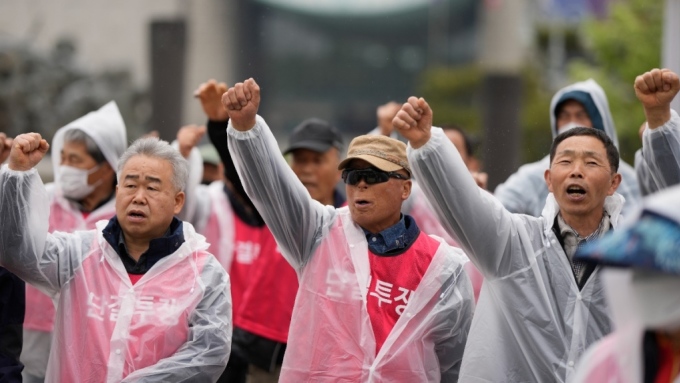 Thành viên hiệp hội chăn nuôi chó biểu tình tại Seoul, Hàn Quốc, ngày 25/4. Ảnh: AP