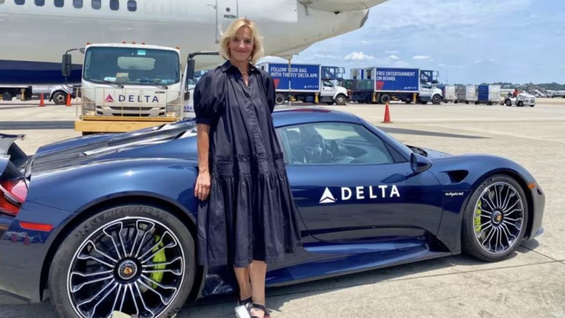 Giám đốc trải nghiệm khách hàng của Delta Airlines - Allison Ausband - tạo dáng bên cạnh mẫu Porsche 918 Spyder màu xanh đậm ánh kim. Ảnh: Allison Ausband.