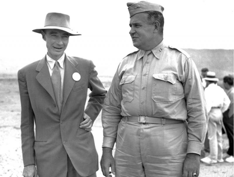 Oppenheimer và tướng John Leslie tại bãi thử Alamos sau khi quả bom đầu tiên thử nghiệm thành công.