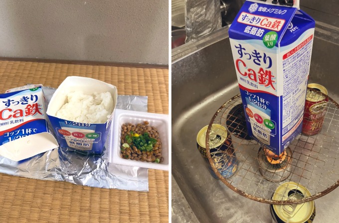 Người đàn ông 45 tuổi tái sử dụng hộp đựng sữa, lon bia để chế dụng cụ nấu thức ăn thay cho bếp điện hoặc nồi cơm. Ảnh: Sato Hideaki