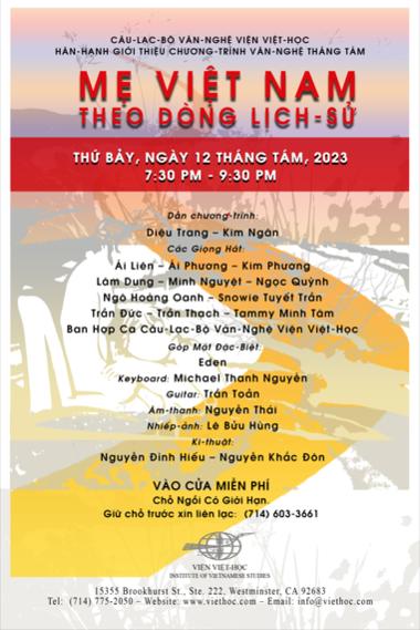 Theo thông cáo báo chí, Câu Lạc Bộ Văn Nghệ Viện Việt Học sẽ tổ chức chương trình ca nhạc chủ đề: “Mẹ Việt Nam Theo Dòng Lịch Sử” vào hôm thứ Bảy, ngày 12 tháng 8, 2023, với sự góp mặt đặc biệt của bé Eden Nguyễn. Chương trình diễn ra vào lúc 7:30 PM-10:30 PM thứ bảy, tại Viện Việt Học ở địa chỉ 15355 Brookhurst St., Suite 222, Westminster, CA 92683. Viện Việt Học gửi lời cảm ơn chân thành cho tất cả sự ủng hộ, tiếp tay giúp quảng bá, cũng như chào đón sự tham dự của quí thân hữu và ân nhân. Đồng thời Viện Việt Học cũng gửi lời cảm tạ đến quí cơ-quan truyền-thông, Quí hội-đoàn, đoàn-thể và cá-nhân đồng tổ chức và yểm trợ các sinh hoạt ý nghĩa vừa qua. Mọi thắc mắc có thể tìm hiểu trên website: www.viethoc.com, hoặc liên lạc qua số điện thoại (714) 775-2050.