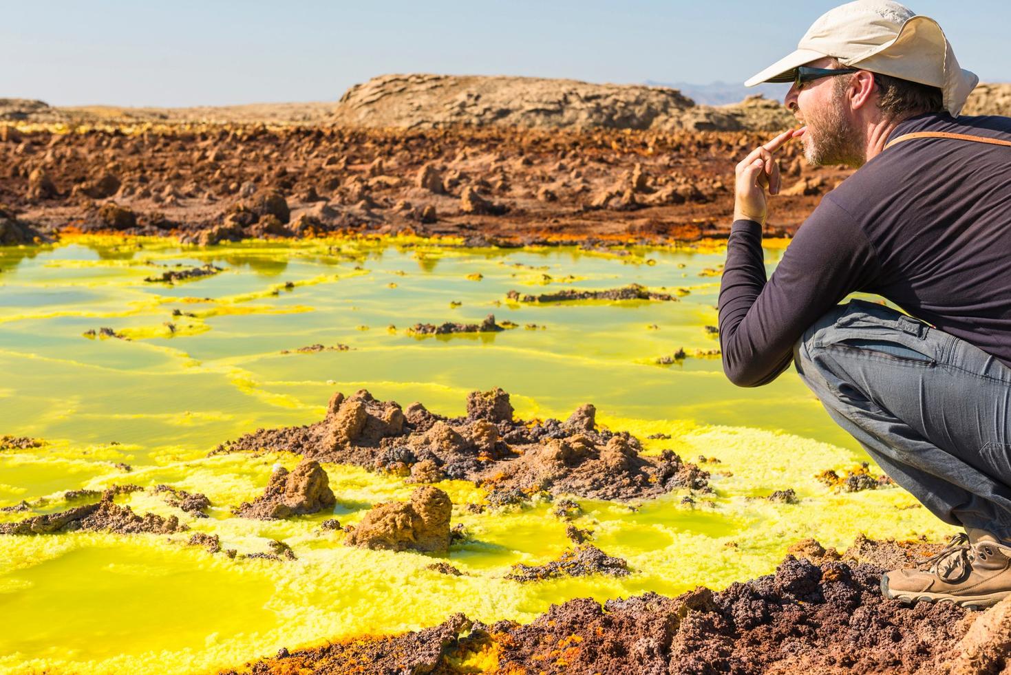 Khu vực xung quanh núi lửa Dallol ở Ethiopia là một địa điểm không giống bất cứ nơi trên Trái đất. Ở đây, khí clo và lưu huỳnh độc hại tràn ngập không khí, trong khi những "cây nấm" khổng lồ được tạo nên từ muối sắt bao phủ toàn bộ cảnh quan. Các mạch nước ngầm sủi bọt và trào lên trên mặt đất, tạo ra những con suối mà bạn sẽ không bao giờ muốn tắm trong đó.