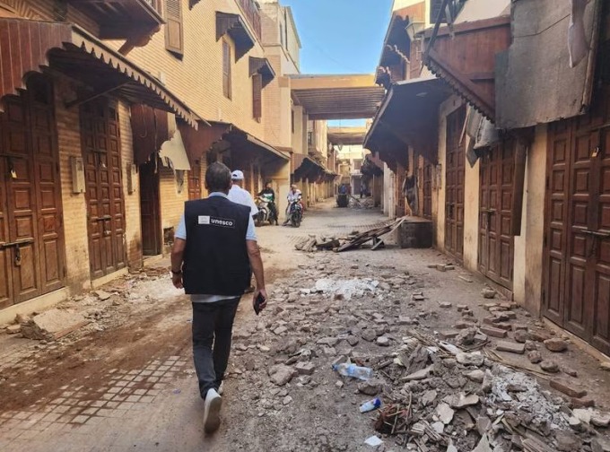 Eric Falt, giám đốc khu vực của UNESCO, đang đi khảo sát khu vực đổ nát trong khu phố cổ tại Marrakesh. Ảnh: AFP