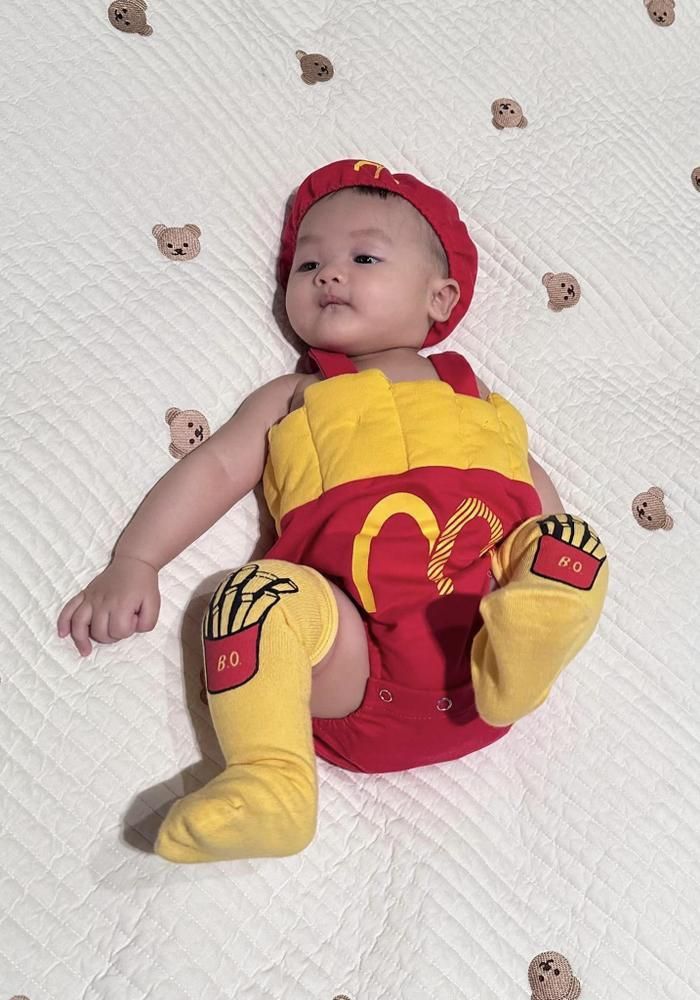 Trong hình ảnh được chia sẻ, quý tử Sutin đội nón, diện trang phục áo liền quần với tông vàng - đỏ nổi bật, "cosplay" thành gói khoai tây chiên của 1 hãng thức ăn nhanh nổi tiếng trông rất đáng yêu. Thế nhưng, biểu cảm của quý tử mới là điều khiến dân tình chú ý. Bởi lẽ, dù còn bé nhưng quý tử Sutin đã biết "lia cam" và tạo dáng trước ống kính vô cùng chuyên nghiệp, "7749 biểu cảm" của nhóc tỳ khiến nhiều người không khỏi thích thú.
