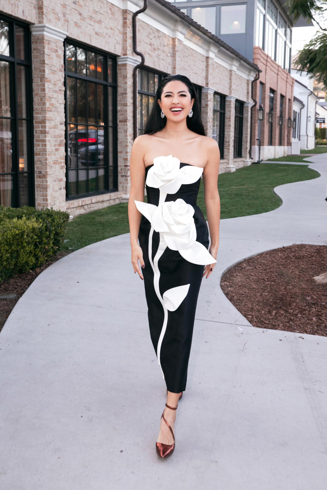 Hoa hậu Hoàn vũ Nhật Bản Juri Watanabe trong bộ đầm đen cúp ngực đính hoa 3D màu trắng tương phản - thiết kế của Đỗ Mạnh Cường được nhiều người yêu thích.