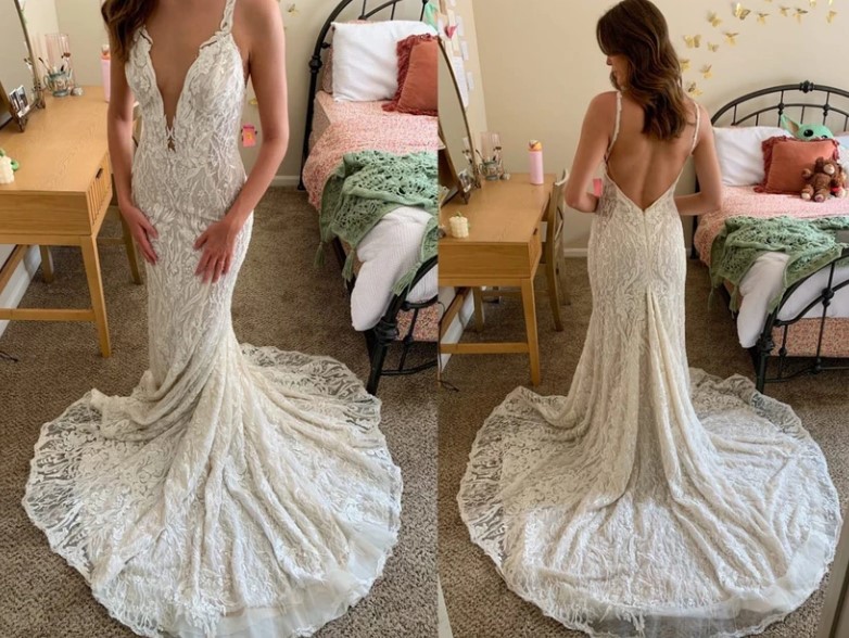 "Có vẻ như nó vừa với kích cỡ của tôi", cô nói. "Vì vậy, chúng tôi đi và thử, và quả thật là nó vừa khít". Chiếc váy phong cách nàng tiên cá có đường viền cổ và lưng thấp, được bao phủ bởi họa tiết ren tinh xảo từ đầu đến chân. Nhà thiết kế nổi tiếng Galia Lahav đã tạo ra chiếc váy cho dòng sản phẩm Gala của mình.