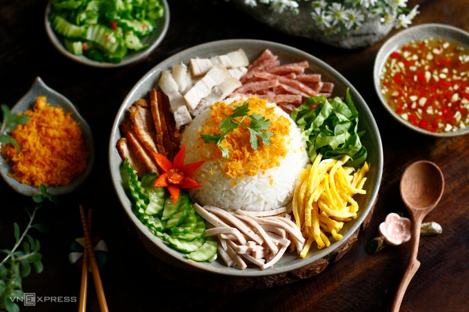 Cơm là thành phần chính của món ăn, người Huế xưa có bí quyết là gạo sau khi vo sạch đem ngâm nước lạnh khoảng 2 giờ rồi đem hấp như đồ xôi sẽ giúp hạt cơm dẻo mềm, để lâu không bị khô. Khi cơm chín, đơm vào bát rồi úp ra đĩa. Gắp các nguyên liệu ăn kèm (thịt nạc dăm nướng, thịt ba chỉ luộc, trứng tráng, giò lụa, nem chua, rau thơm, dưa chuột trộn) xếp xen kẽ xung quanh với 7 màu sắc bắt mắt. Trên cùng rắc tôm cháy, trang trí thêm nhánh rau thơm thêm phần hấp dẫn. Dọn kèm bên cạnh là bát nước mắm chua ngọt.