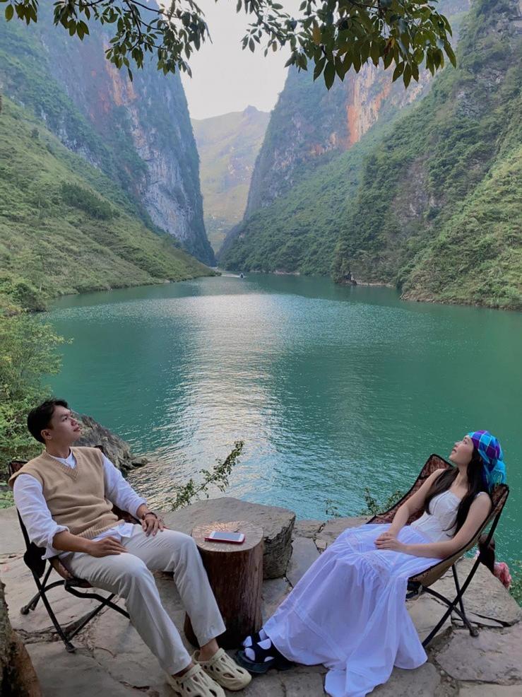 Ngân cho biết, đi Hà Giang, mọi người đừng quá đặt trọn niềm tin vào Google Map. “Đoạn tìm đường ra sông Nho Quế, chúng mình bị lạc vào đường cùng, nhưng may mắn khám phá được một điểm sống ảo cực đẹp, cũng là view sông Nho Quế nhưng với một góc khác”, Ngân kể lại.