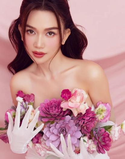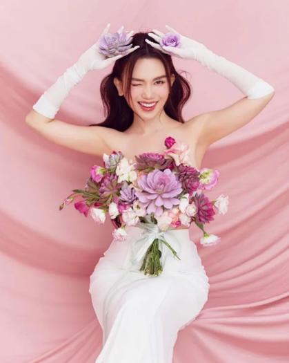 Background được trang trí với tone hồng cùng trang phục trung tính là trắng và be. Sĩ Thanh dùng sen đá làm áo tạo nên điểm độc đáo cho bộ ảnh.