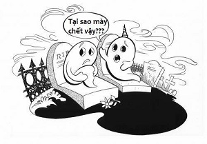 - Tôi à? Tôi chết vì bị đau tim đột ngột! Ông biết không, tôi hay tin vợ đang ngoại tình ở nhà liền chạy về nhà để bắt quả tang. Nhưng khi về đến nơi thì tôi chỉ thấy cô ta một mình quấn quanh người một tấm chăn mỏng mà chẳng thấy gã nhân tình kia đâu. Tôi kiếm quanh nhà cả tiếng đồng hồ rồi chạy xuống tầng hầm nhưng chẳng thấy ai, tôi chạy lên tầng hai cũng không thấy. Cuối cùng, tôi hộc tốc chạy lên gác thượng, vừa lên tới nơi thì mệt quá và cơn đau tim ập tới, tôi lăn quay ra chết mà chẳng kịp trăn trối một lời.