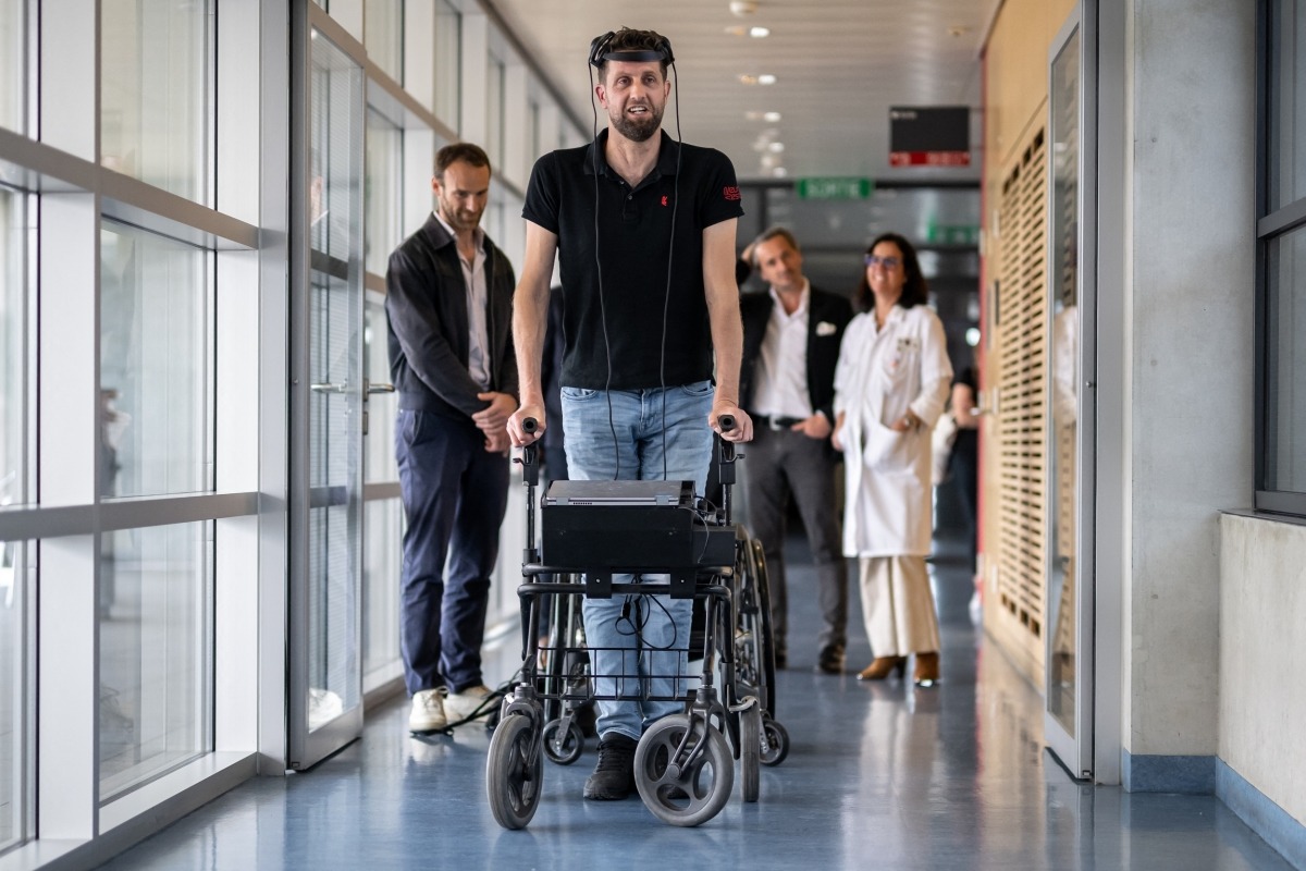 Gert-Jan, người Hà Lan, 40 tuổi, bị liệt do chấn thương tủy sống, đi lại sau buổi họp báo ở Lausanne, Thụy Sĩ, ngày 23/5. Sau hơn một thập kỷ nghiên cứu, các nhà khoa học Pháp và Thụy Sĩ đã giúp người liệt đi lại nhờ thiết bị cấy ghép khôi phục kết nối giữa não và tủy sống.