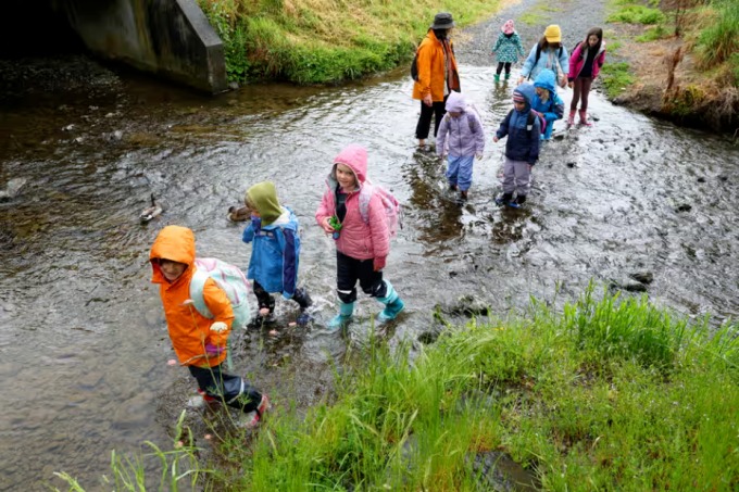 Học sinh Bush Sprouts cùng các giáo viên vượt một con suối. Ảnh: Guardian
