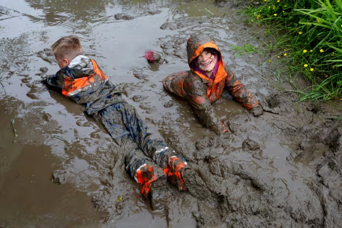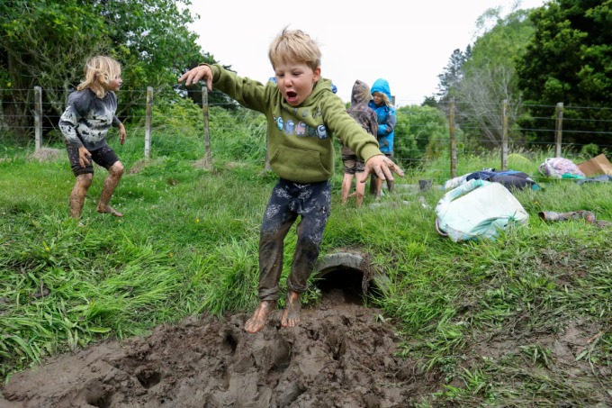Cậu bé Reid Payne, 6 tuổi, vùng vẫy trong đống bùn với khuôn mặt lấm lem nhưng rạng rỡ. Mẹ của Reid, Amy Toomath, nói: "Bé luôn hào hứng, phấn chấn và không thích ngồi yên, giống như quả bóng bật lại khi va vào tường, vì vậy chúng tôi dỡ bỏ những bức tường".