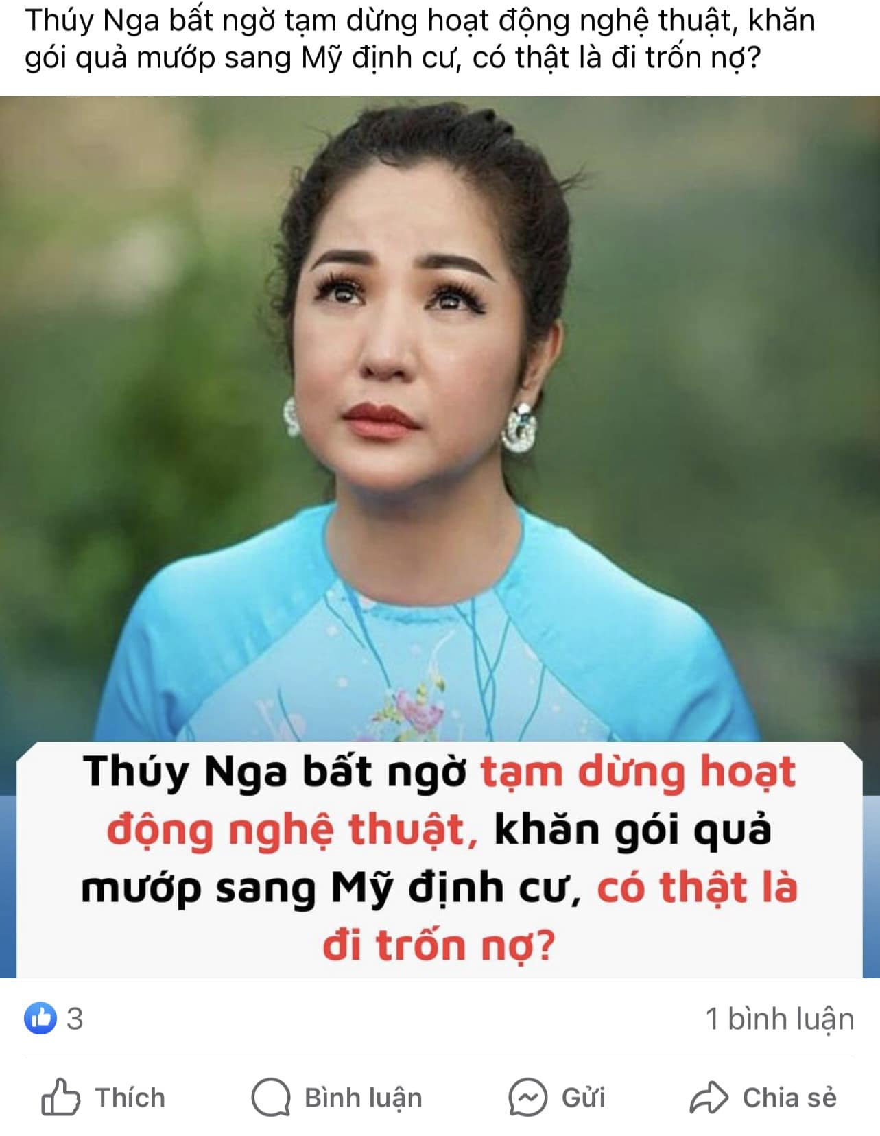 Diễn viên Thúy Nga đã nhanh chóng lên tiếng trước tin đồn sang Mỹ trốn nợ. Chia sẻ trên trang cá nhân, cô đăng tải bài viết với thông tin sai lệch về mình.