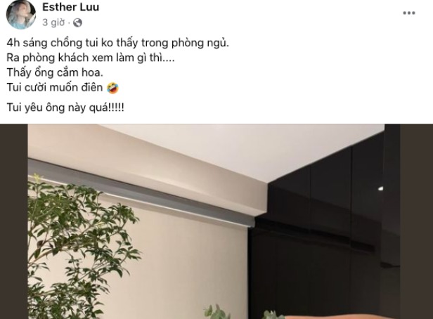 "4h sáng chồng tui không thấy trong phòng ngủ. Ra phòng khách xem làm gì thì...Thấy ông cắm hoa. Tui cười muốn điên. Tui yêu ông này quá!!" - Hari Won chia sẻ.