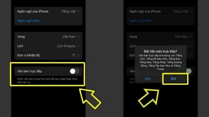 Bước 3: Bạn chạm vào "Ngôn ngữ & Vùng", sau đó bật tính năng "Văn bản trực tiếp".