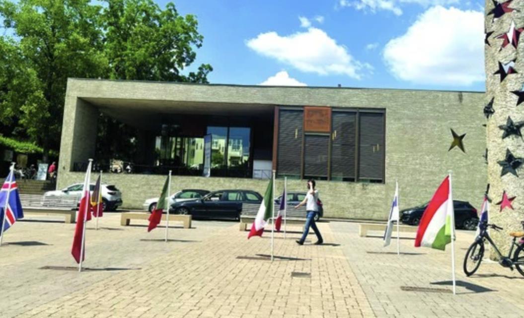 Cờ của các nước trong Khối Schengen trước cửa Bảo tàng châu Âu ở Schengen