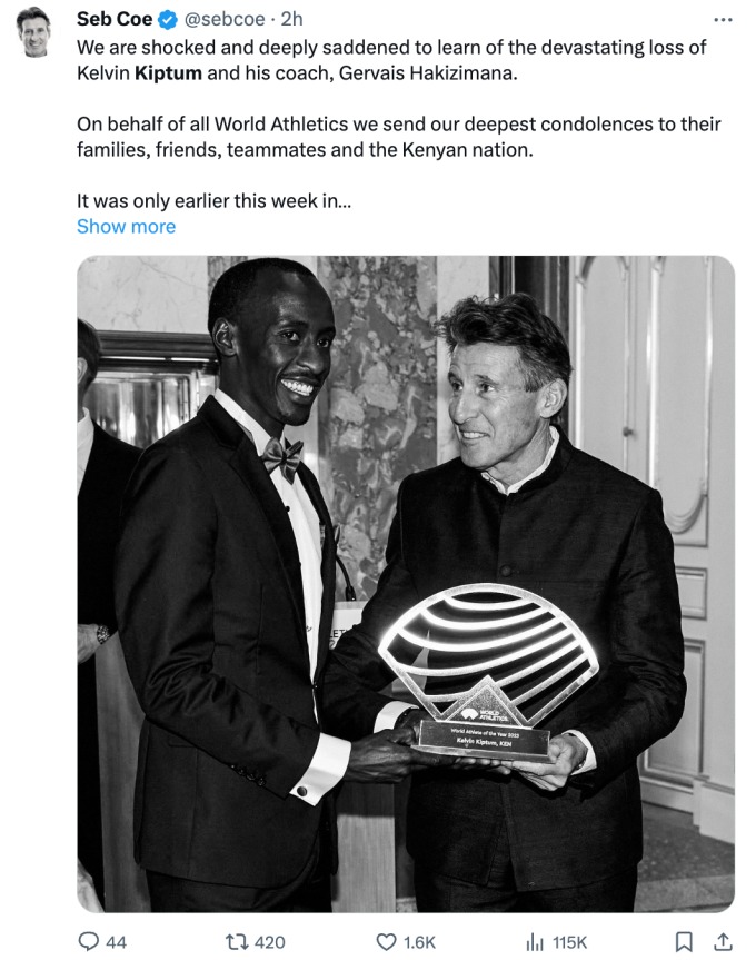 Trên X - mạng xã hội trước đây tên là Twitter, Seb Coe, chủ tịch của Liên đoàn Điền kinh Thế giới (World Athletics), cho biết ông bị sốc và đau buồn sâu sắc khi hay tin Kiptum và HLV Gervais Hakizimana qua đời.