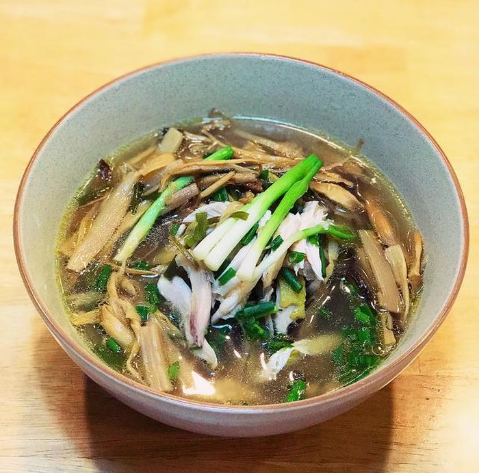 Món ăn với phần nước dùng thơm ngon, thịt gà được luộc mềm, ngọt thịt cùng với miến dong mềm dai, nấm hương thơm, măng khô mềm nhưng gịn hấp dẫn.