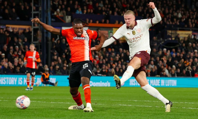 Haaland (phải) ghi bàn nâng tỷ số lên 2-0 cho Man City trong trận thắng Luton 6-2 trên sân Kenilworth Road, hạt Bedfordshire, Anh, vòng năm Cup FA tối 27/2/2024. Ảnh: Reuters
