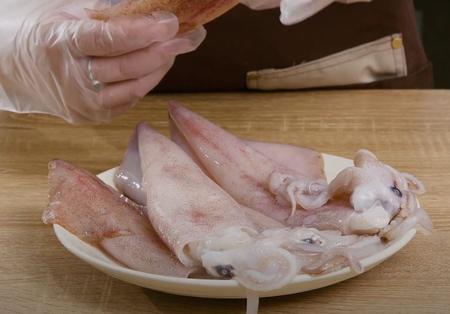Khi sơ chế mực, bạn cần lấy phần túi mực bên trong ra để món ăn không bị đen. Có thể cắt bỏ phần mắt mực.
