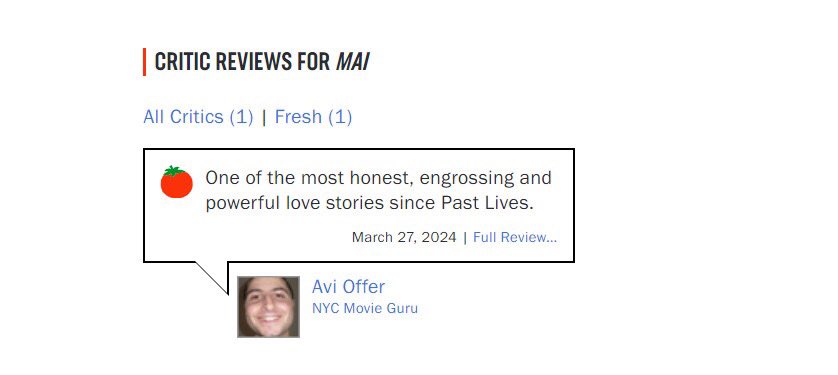 Theo chia sẻ của Trấn Thành, Mai đã nhận về ý kiến đầu tiên trên chuyên trang đánh giá phim nổi tiếng Rotten Tomatoes, từ Avi Offer, thành viên của New York Film Critics Online.