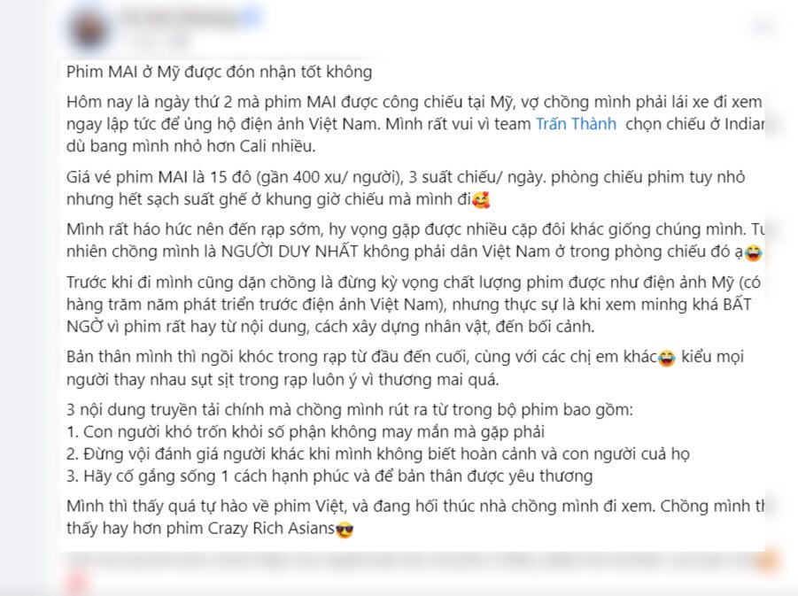 Ngoài ra, một số khán giả ở nước ngoài cũng bày tỏ cảm xúc khi xem Mai.