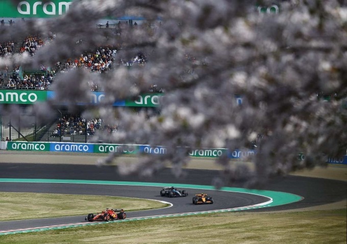 Charles Leclerc chạy trước Lando Norris (McLaren) và George Russell (Mercedes) trên đường đua Suzuka chiều 7/4. Ảnh: Reuters