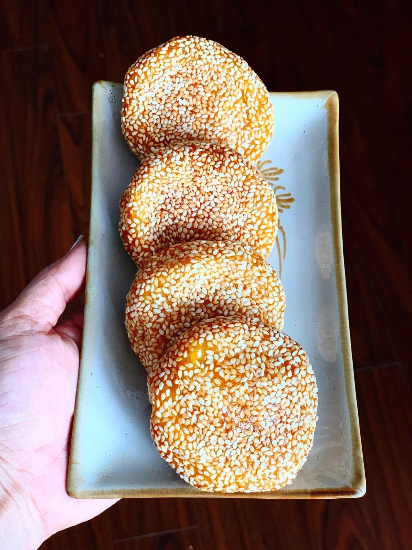 - Vừng rang lên nặn bánh xong lăn vừng (cho vừng vào cái bát tô lăn và vùi bánh vào vừng sẽ bám đều) khi chiên lửa vừa lật liên tục. Khi bánh vàng đều và phồng căng thì vớt ra cho ráo dầu rồi thưởng thức.