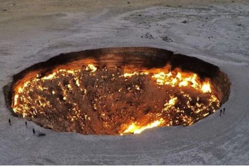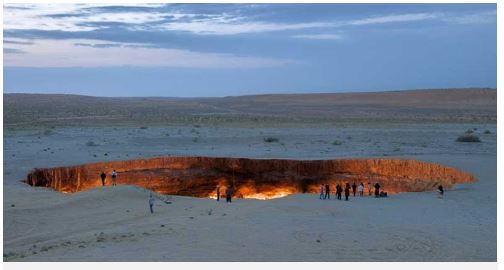 Miệng núi lửa khí Darvaza nằm ở làng Derweze thuộc tỉnh Ahal của Turkmenistan . Đây là một miệng núi lửa nhân tạo được tạo ra vào năm 1971 trong quá trình thăm dò khí đốt tự nhiên thời Liên Xô. Chuyện kể rằng nhà địa chất Liên Xô đã khoan một lỗ trên lòng đất và phát hiện ra một hang động chứa đầy khí đốt tự nhiên. Mặt đất bên dưới giàn khoan sụp đổ, tạo ra miệng núi lửa khổng lồ mà chúng ta thấy ngày nay. Lo sợ khí gas sẽ gây hại cho dân làng gần đó, các nhà khoa học đã đốt mỏ, hy vọng rằng nó sẽ cháy hết trong vài ngày tới. Tuy nhiên, ngọn lửa vẫn cháy kể từ đó, hơn 50 năm nay.