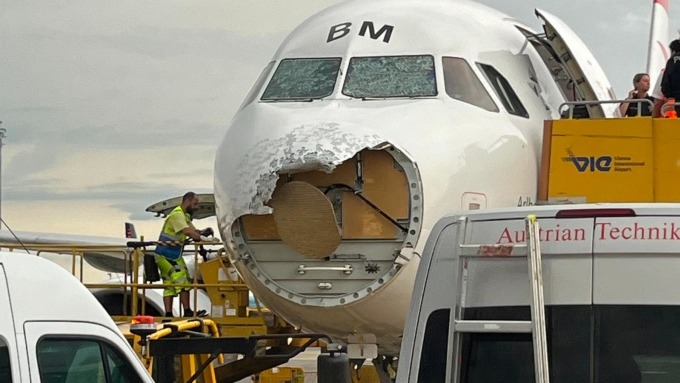 Chiếc máy bay của Austrian Airlines bị trận mưa đá làm vỡ mũi và nứt cửa sổ buồng lái, trong lúc Áo đang đối mặt các đợt giông bão lớn.