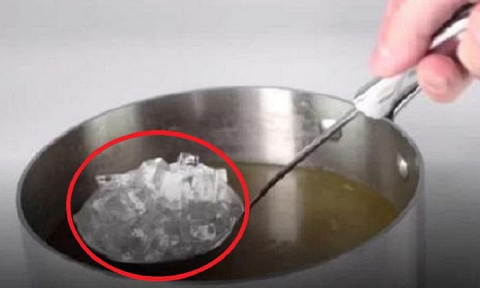 - Thả vài viên đá vào nồi canh hút bớt dầu mỡ: Nếu bạn từng gặp phải tình trạng lỡ tay cho quá nhiều dầu ăn khi nấu, hoặc nồi canh, súp, nước lèo bún, phở... lênh láng váng mỡ, hãy sử dụng đá lạnh để xử lý. Nhiều người nấu ăn chuyên nghiệp giải thích, lợi ích lớn nhất khi cho đá lạnh vào một nồi canh đang sôi đó là để đá hút bớt dầu mỡ. Dầu sẽ nhanh chóng bám vào đá, từ đó nồi canh người dùng đang nấu nếu bị quá mỡ hoặc lỡ quá nhiều gia vị, có thể được cải thiện phần nào. Hãy thả viên đá vào nồi canh thật nhanh, sau đó dùng thìa hoặc muôi vớt nó ra.