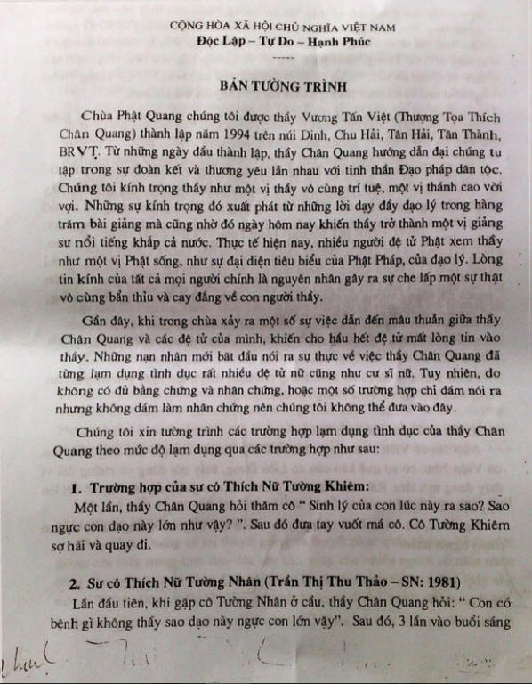 Bản tường trình thầy Thích Chân Quang lạm dụng tình dục và bội tín với tập thể phật tử