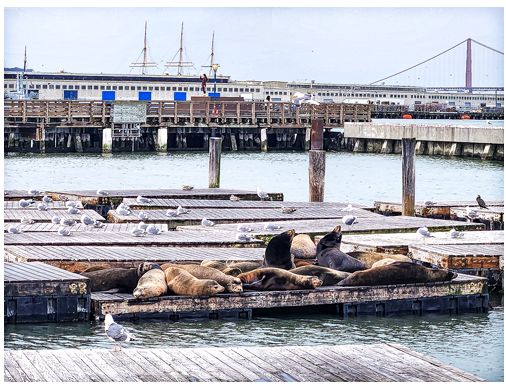 Nơi tôi yêu thích nhất là cầu tàu số 39 - Pier 39, gần khu vực trung tâm cảng. Bến tàu được xây dựng vào năm 1936 như một phần của khu trưng bày quốc tế Golden Gate. Ban đầu, bến tàu được sử dụng để vận chuyển hàng hóa và hành khách. Tuy nhiên, vào những năm 1970, khu vực này đã phát triển thành địa điểm du lịch nổi tiếng. Năm 1990, sau trận động đất lớn ở San Francisco, những chú sư tử biển bắt đầu tập trung trên bến tàu số 39. Ban đầu, sự hiện diện của chúng gây ra một số bất tiện cho du khách khi khu vực tham quan được chia nhỏ lẻ. Nhưng rồi thời gian qua đi, đó lại là nét đặc sắc hiếm có của nơi này.