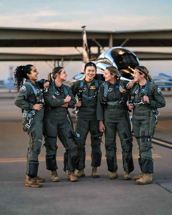 Năm nữ Phi công lái chiến đấu cơ của Không Quân Hoa Kỳ, h́nh cô gái đứng ở giữa là nữ Phi công người Việt lái chiến đấu cơ siêu thanh F16 của Không Lực Hoa Kỳ, Nữ Trung úy Jenny Nguyen. Bố của Jenny Nguyen là người Việt, Mẹ là người Nam Hàn. Ông nội của Jenny Nguyễn là Sĩ quan trong Binh Chủng Biệt Động Quân VNCH. Cha của cô vượt biên đi cùng người Chú ruột qua định cư bên Hoa Kỳ lúc đó c̣n là thanh thiếu niên, sau này gặp mẹ của cô là người Nam Hàn làm cùng chung một hăng, hai người đă lấy nhau và có 3 người con 2 gái 1 trai. Jenny là con gái đầu ḷng, cô được nghe ông Chú của cô hay kể về ông Nội của cô là một sĩ quan trong Quân Lực Việt Nam Cộng Ḥa. Cô rất ái mộ ông Nội và hănh diện là con cháu của Việt Nam Cộng Ḥa. Cô gia nhập vào Quân Chủng Không Quân Hoa Kỳ và hiện nay cô mang cấp bậc Trung uư lái chiến đấu cơ siêu thanh F16.