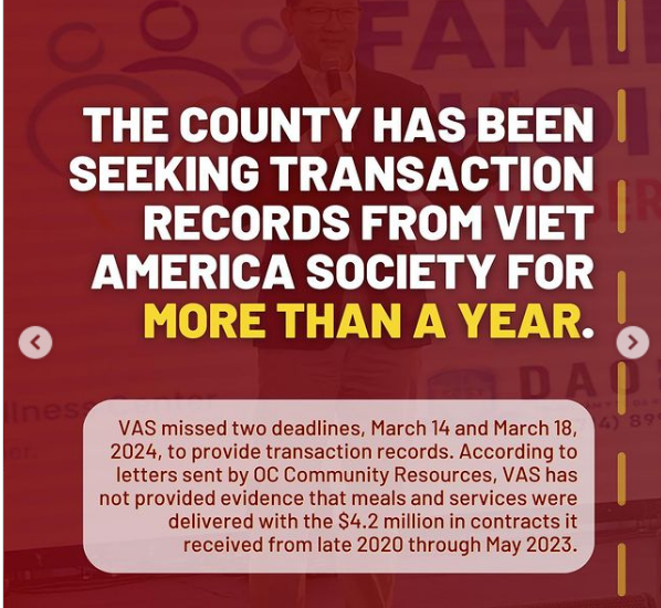 Bất chấp những yêu cầu gần đây từ giới chức Quận Cam, Viet America Society (VAS) sẽ không trả lại 2.2 triệu mỹ kim tiền cứu trợ Covid, mặc dù không nộp cho quận tài liệu để chứng minh số tiền đã được chi tiêu như thế nào. Ông Sterling Scott Winchell, luật sư của VAS, cho biết ban lãnh đạo của nhóm không có ý định hoàn trả số tiền được Giám sát viên Quận 1 Andrew Đỗ chuyển cho họ. Quận đã yêu cầu vào ngày 26 tháng 7 rằng 2.2 triệu mỹ kim phải được trả lại trước ngày 26 tháng 8, lưu ý rằng VAS đã sa thải công ty kế toán đang tiến hành kiểm toán theo yêu cầu của liên bang đối với số tiền. Công ty đó, Pun Group, nói rằng VAS “thiếu các biện pháp kiểm soát nội bộ, không tuân theo các hướng dẫn thống nhất của liên bang, không tuân theo hướng dẫn của nguồn tài trợ, và thiếu hồ sơ cần thiết để thiết lập dấu vết kiểm toán.” Giới chức của quận cho biết Pun Group đã lập kế hoạch trích dẫn những thiếu sót trong báo cáo kiểm toán trước khi bị VAS sa thải. Viet America Society đã nộp “báo cáo kiểm toán đơn lẻ” của liên bang chậm trễ cho các năm tài chính 2020-21 và 2021-22. Quận đã nhiều lần yêu cầu tổ chức phi lợi nhuận này cung cấp báo cáo kiểm toán, bắt đầu từ tháng 9 năm 2023. Đồng thời, tổ chức đã được gia hạn nhiều lần, gần đây nhất là vào cuối tháng 7. Ông Winchell cho biết mặc dù cuộc kiểm toán có thể tìm ra những điểm mà Viet America Society có thể cải thiện trong cách họ lưu giữ hồ sơ, nhưng không có lý do gì để trả lại tiền. Ông cho biết cuộc kiểm toán dự trù sẽ được hoàn thành bởi một công ty kế toán mới trong vài tuần nữa.